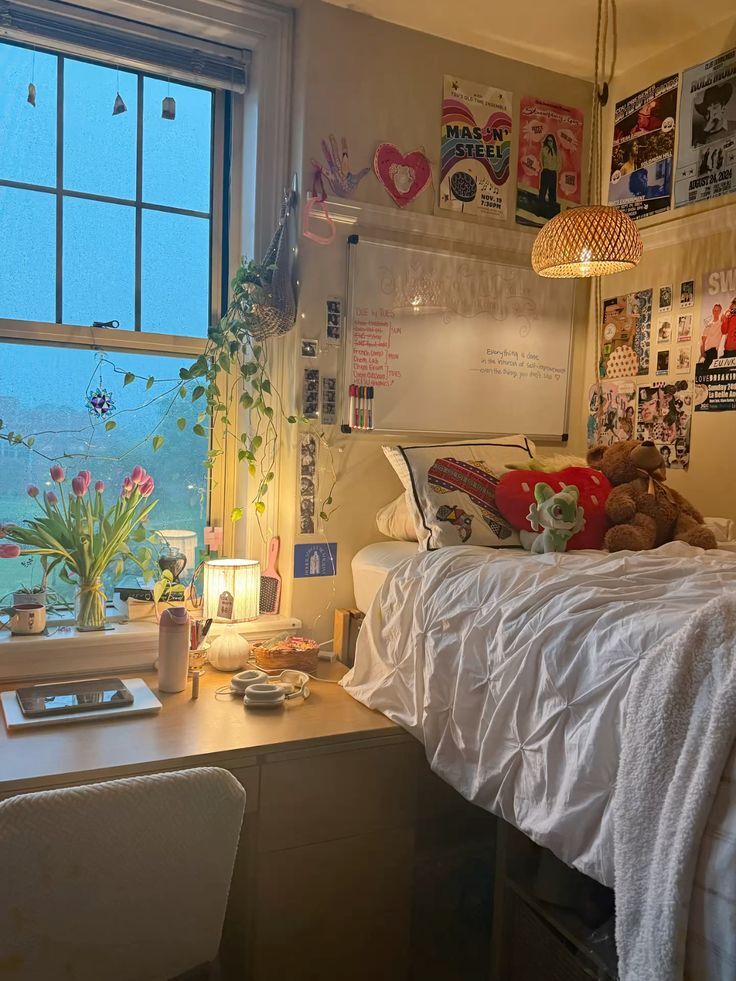 That overhead light? Not the vibe. Add a table lamp or fairy lights for a warmer glow that doesn’t scream “institutional.” Lighting changes everything, and it makes your dorm feel more like you.