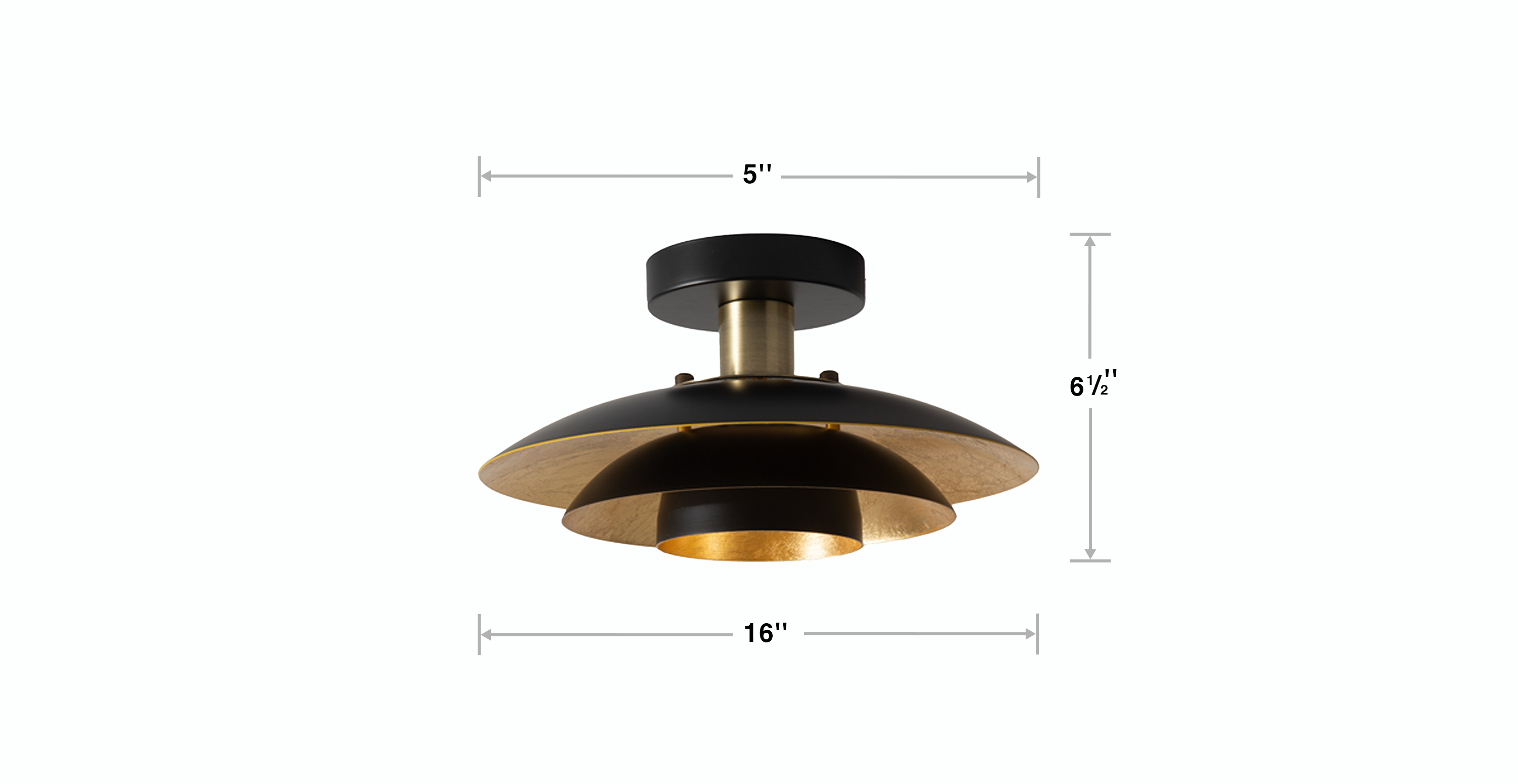 The Rancho Mirage Flush Mount Ceiling Light, a luminary masterpiece that brings a touch of vintage-inspired elegance to your overhead space. Crafted with meticulous precision, this ceiling light features a weathered brass finish and a matte black sculptred shade, creating a captivating interplay of light and shadow. The hand-applied gold-leaf finish underneath the shade casts a warm and inviting glow, transforming any room into a sanctuary of ambient charm and refined style.